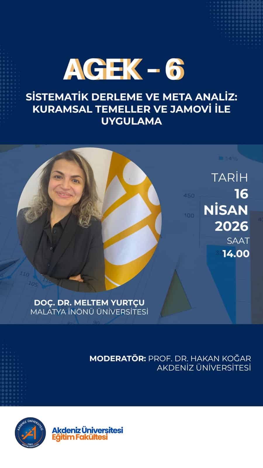 Akdeniz Üniversitesi Eğitim Fakültesi tarafından düzenlenen Akademik Gelişim ve Eğitim Kurulu (AGEK) serisinin altıncı oturumu, çevrim içi platformda gerçekleştirildi. Türkiye genelinden araştırmacıların ve akademisyenlerin katıldığı etkinlikte, modern akademik çalışmaların temelini oluşturan Sistematik Derleme ve Meta Analiz konuları ayrıntılı şekilde ele alındı.
