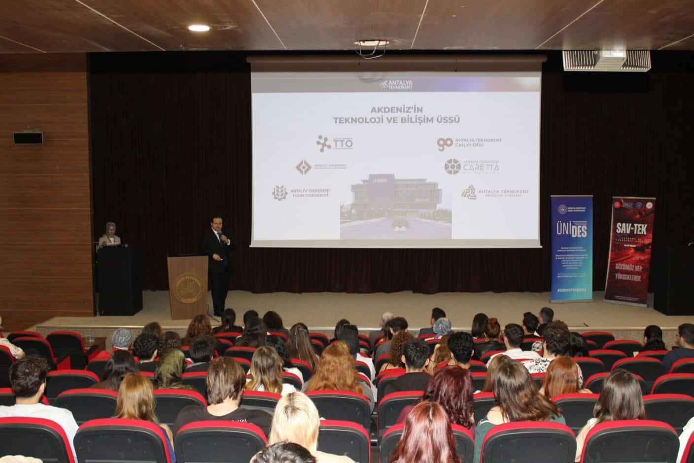 İletişim Fakültesi Konferans Salonu’nda düzenlenen etkinlikte; Antalya Teknokent Genel Müdürü Dr. İbrahim Yavuz, Antalya Gençlik ve Spor İl Müdürü Yavuz Gürhan, Robiduck Kurucu Ortağı Çağdaş Taşpınar, Maren Robotics Kurucu Ortağı Utku Atay ve Desird Tasarım Ar-Ge Müdürü Hakan Şahin konuşmacı olarak yer aldı. Katılımcılar, sektör deneyimlerini ve teknoloji dünyasındaki güncel gelişmeleri gençlerle paylaştı.