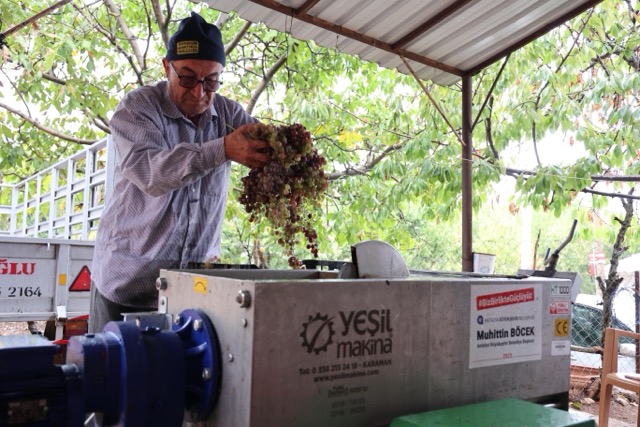 Büyükşehir Belediyesi Tarımsal Hizmetler Dairesi Başkanlığı, yerelden kalkınma hedefleri doğrultusunda üreticilere makine desteği sağlamaya devam ediyor. Antalya genelinde toplamda 23 üzüm sıkma makinesi mahalle mahalle dolaşarak pekmez üretiminde kullanılıyor. Pekmez üretiminde insan gücüyle saatler sürecek üzüm sıkma işlemi üzüm sıkma makinesi ile dakikalar içerisinde yapılarak üreticilere iş gücü sağlıyor. Zaman ve ürün kaybının da önüne geçen makineler üreticilerden yoğun ilgi görüyor. Antalya’da üzüm üretiminin en çok yapıldığı ilçelerin başında yer alan Elmalı’nın mahallelerine gelen talepler doğrultusunda Antalya Büyükşehir Belediyesi tarafından 6 üzüm sıkma makinesi hibe edildi.