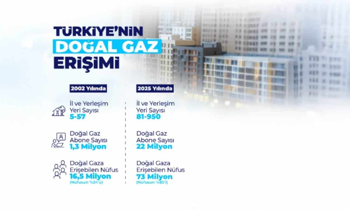 Enerji ve Tabii Kaynaklar Bakanı Alparslan Bayraktar, son 23 yılda Türkiye’nin enerji altyapısında önemli ilerlemeler kaydedildiğini belirterek, 81 il, 950 yerleşim yeri ve 229 organize sanayi bölgesine (OSB) doğal gaz ulaştırıldığını söyledi. Bayraktar, “Son bir yılda 51 yerleşim yerine daha doğal gaz arzı sağladık ve Türkiye genelinde konut abone sayısı yaklaşık 1 milyon arttı.” ifadelerini kullandı.