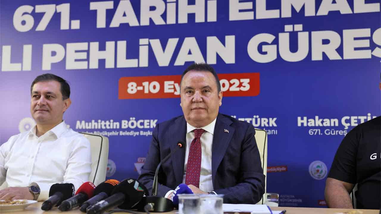 8-9-10 Eylül 2023 tarihleri arasında düzenlenecek Türk’ün ilk Er Meydanı 671’inci Tarihi Elmalı Yağlı Pehlivan Güreşleri ile ilgili basın toplantısına Antalya Büyükşehir Belediye Başkanı Muhittin Böcek, Elmalı Belediye Başkanı Halil Öztürk, Büyükşehir Belediyesi Spor Kulübü Başkanı Ramazan Karabulut, Elmalı Güreş Ağası Hakan Çetin ve Antalyalı Altın Kemer sahibi başpehlivanlar İsmail Balaban, Yusuf Can Zeybek, Ali Gürbüz, Orhan Okulu, Mustafa Taş ile Osman Aynur katıldı.
